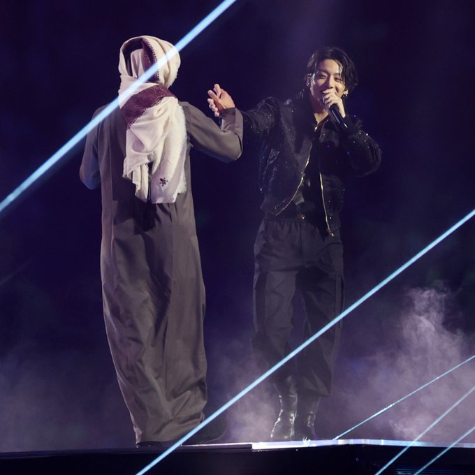 정국은 카타르 가수 파하드 알쿠바이시와 수십 명의 댄서와 함께 화련한 무대를 선보였다.