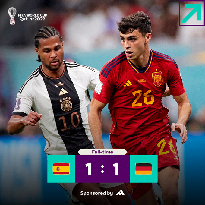 1차전 일본전에서 예상외의 패배를 기록한 독일은 2차전 스페인전에서 승점을 획득해야만 했다. 그러나 계획대로 잘되지 않았다. 스페인에 종종 밀리는 모습을 보여줬다. 전반 40분에 우쪽 측면에서 요주아 키미히가 올린 프리킥을 안토니오 뤼디거가 헤딩으로 넣었는데, VAR 판독 결과 오프사이드로 판정이나 골이 취소되었다.